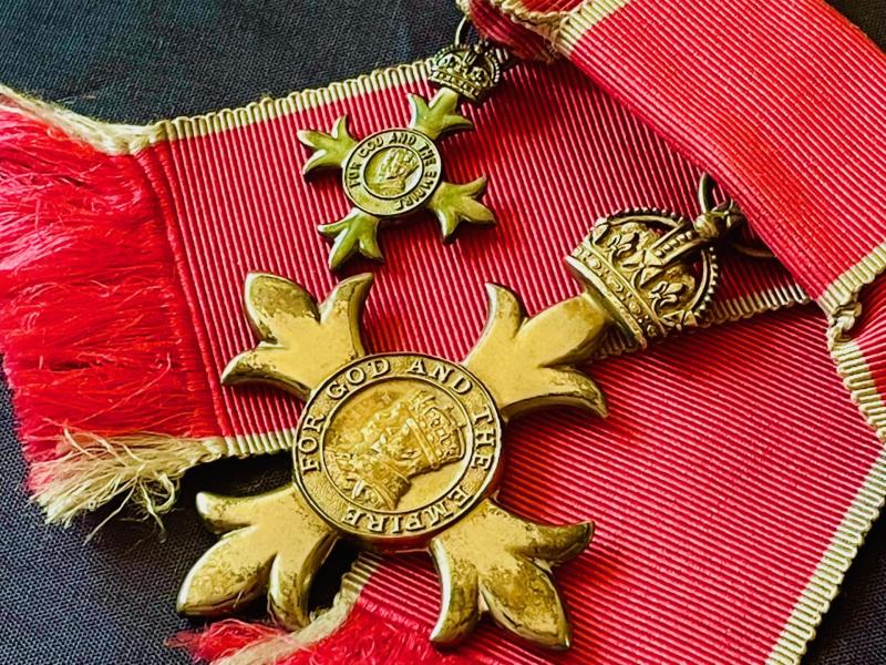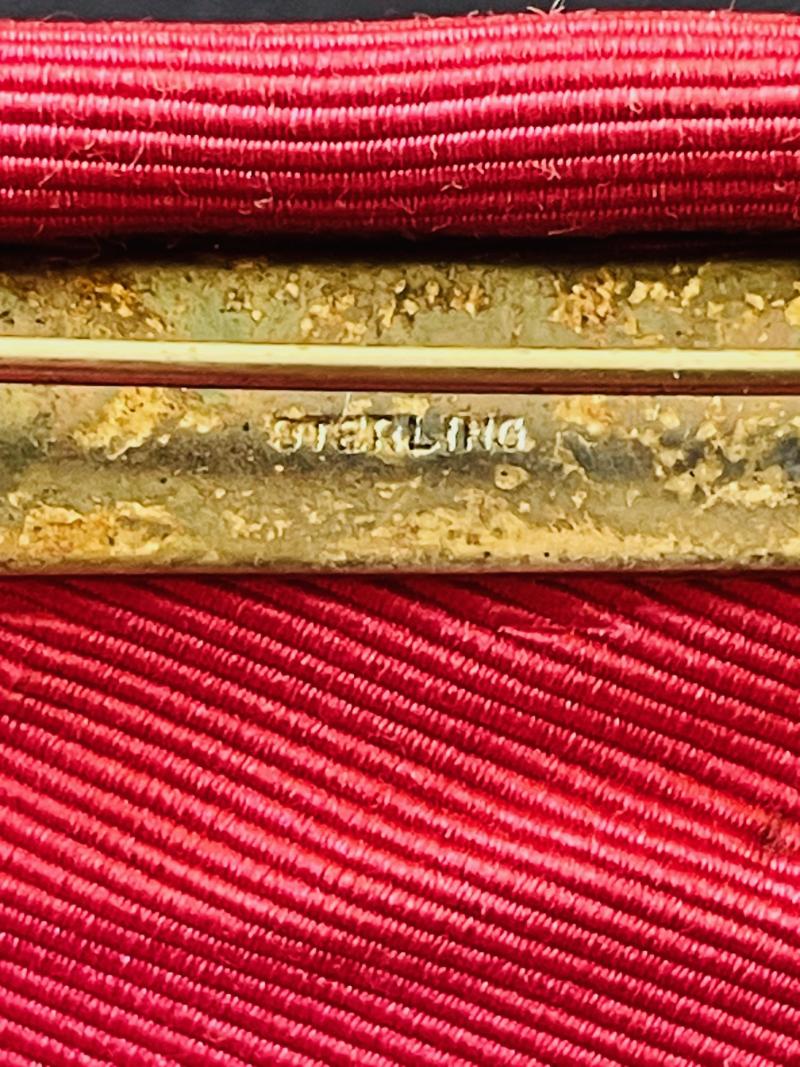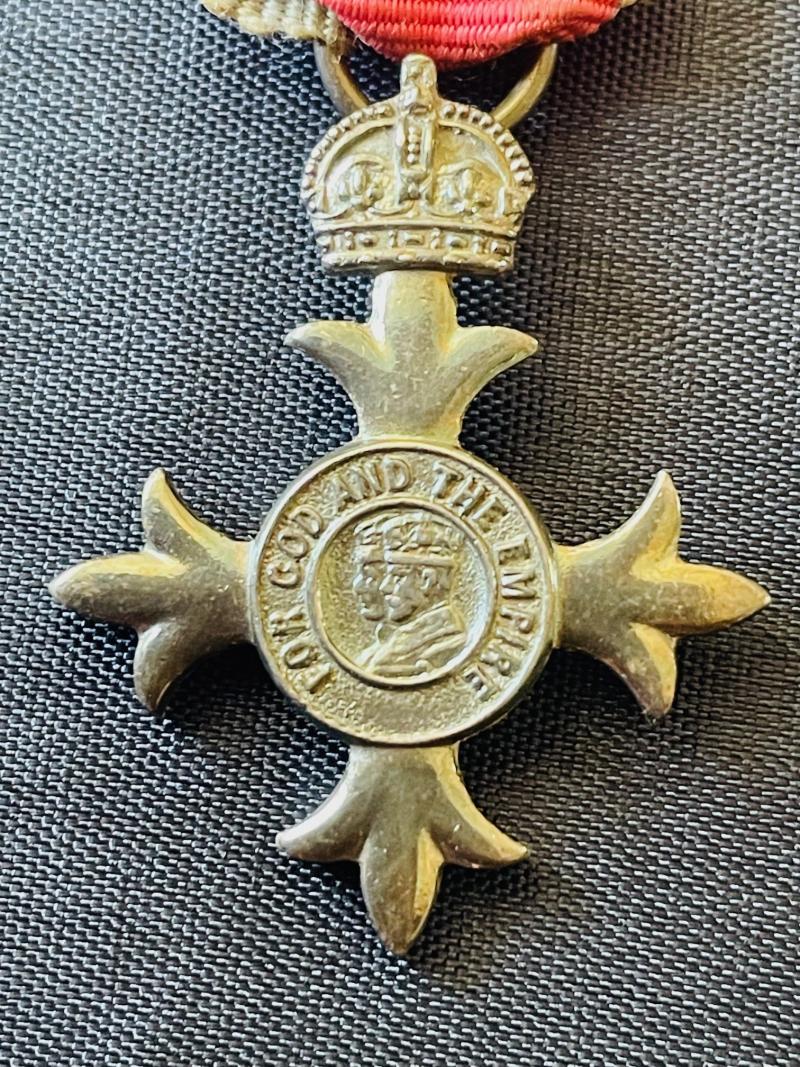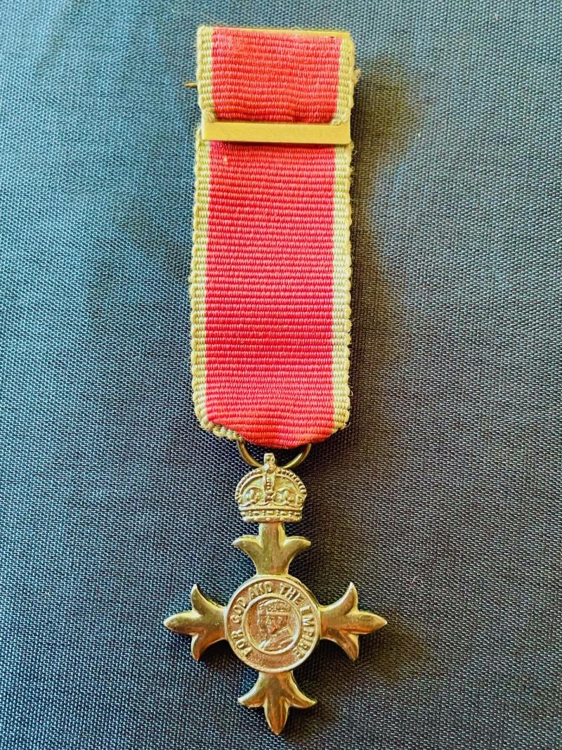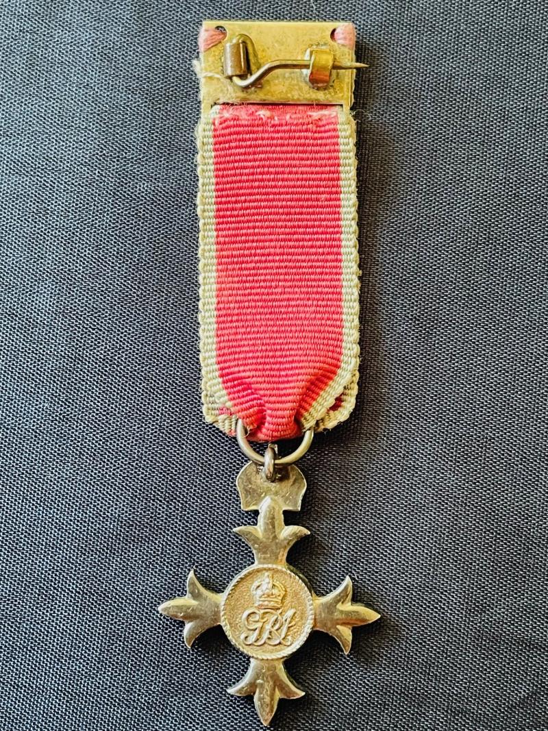 A great opportunity to obtain an original full size 1940s MBE with case of issue, and its original miniature MBE medal and with card on how to wear Made by Royal Mint London. both medals are still in very good finishing as you can see from the photos, with original red silk water fleck ribbon with white stripes to each side and pin back attachment. To the top front of medal, we see the Kings Crown prominent and present, conjoined Side facing cameo of King and Queen. Stamped STERLING to reverse of the large example. The presentation case in which the medal is housed is of a black leatherette finishing, block letters in gold MBE. Press to release catch which is in perfect working order. To the inside a cream velvet base with a silk padded liner to the roof with the full Royal Mint stamp and comes with the harder to find original instruction card of how to wear and full documentation please view photos. Ref 0992