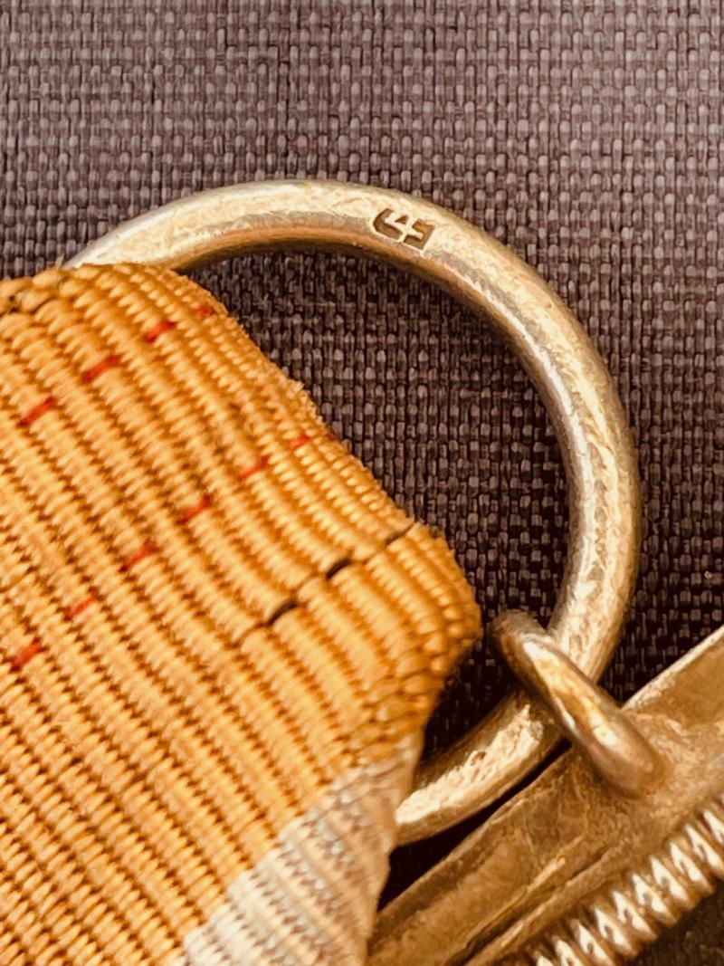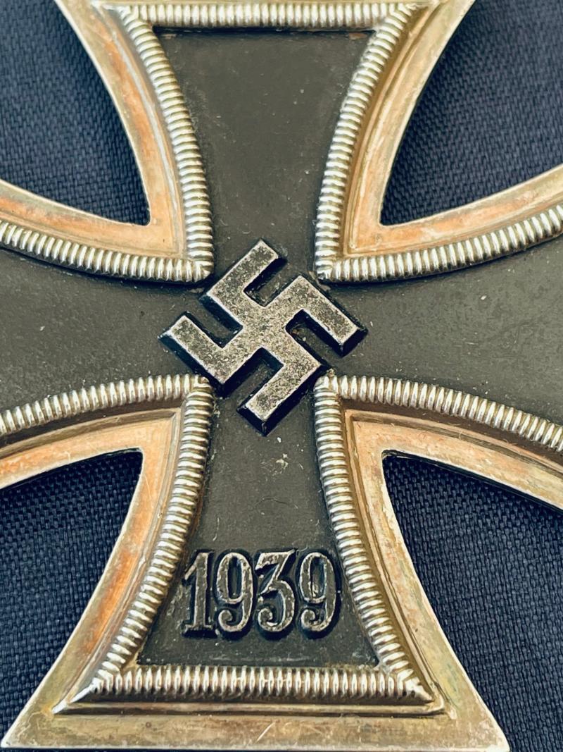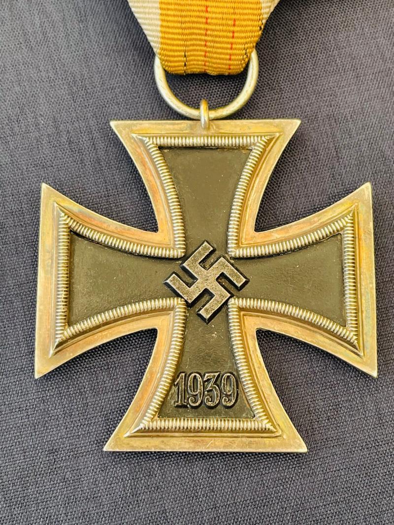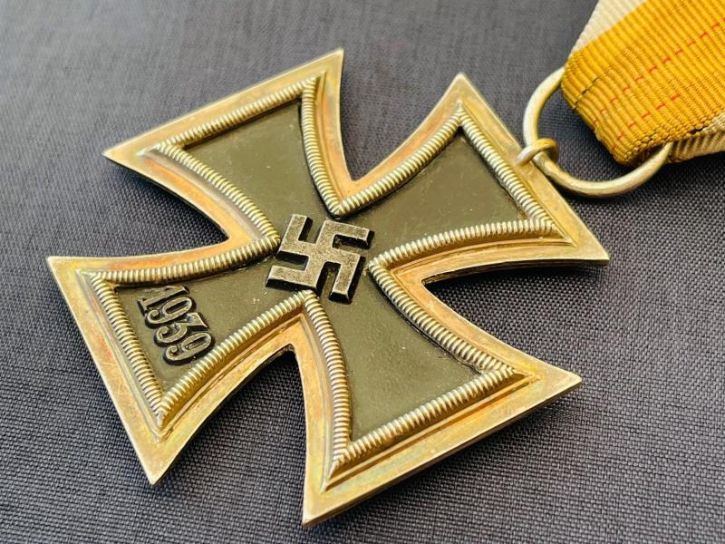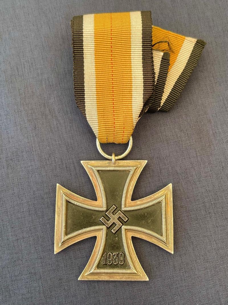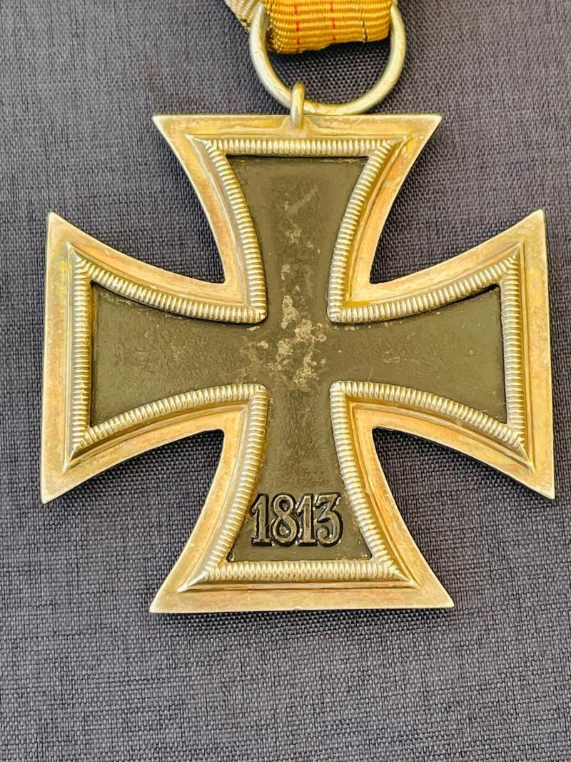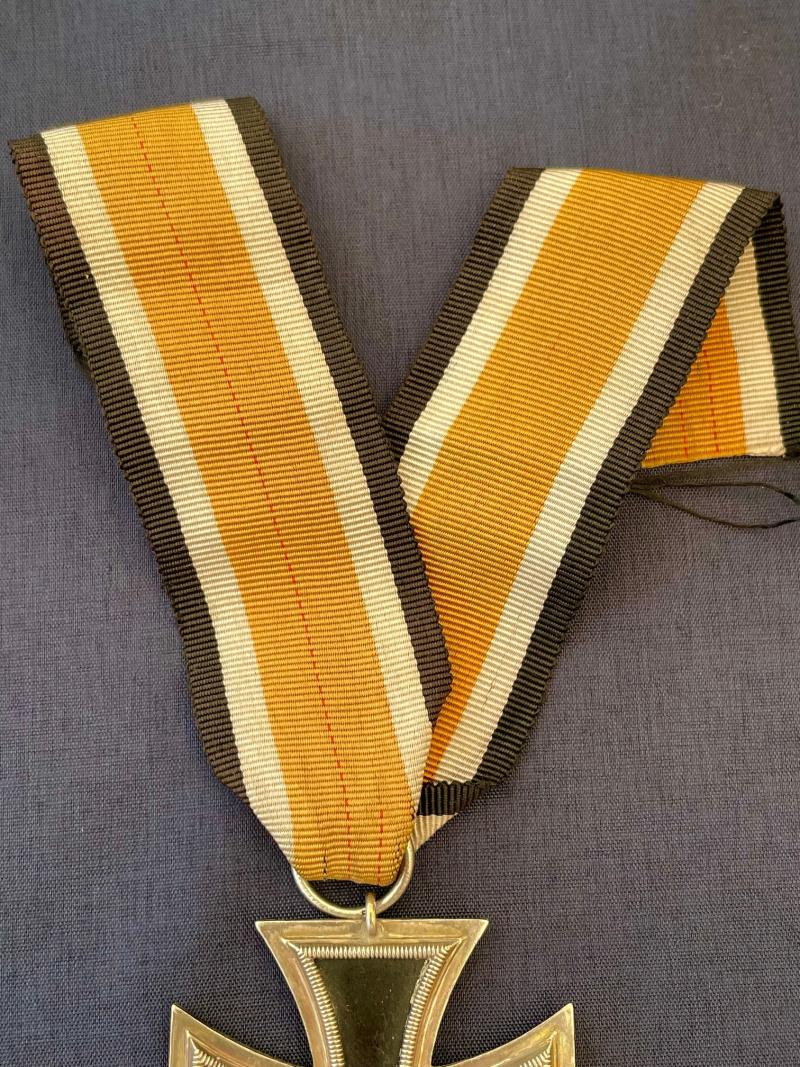 Rare maker Iron Cross 2nd Class with early orange ribbon by very renowned iron cross maker Steinhauer & Luck of Ludenscheld. The cross in 3-part construction with suspension ring stamp number 4 and ribbon intact. the cross still retaining much of its original outer silver frosting to front and back and made of solid German silver. Iron core to centre with original black paint remaining some paint loss and with PKZ Code stamp number 4 to ring, this denoting the very desirable renowned maker Steinhauer & Luck who were the prestige makers of the highest award the Micro 800 Knights Cross of the Iron Cross. In very condition great age toning and never been cleaned. Rare cross maker to find.