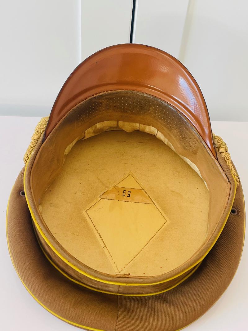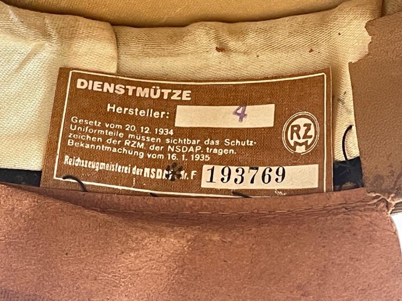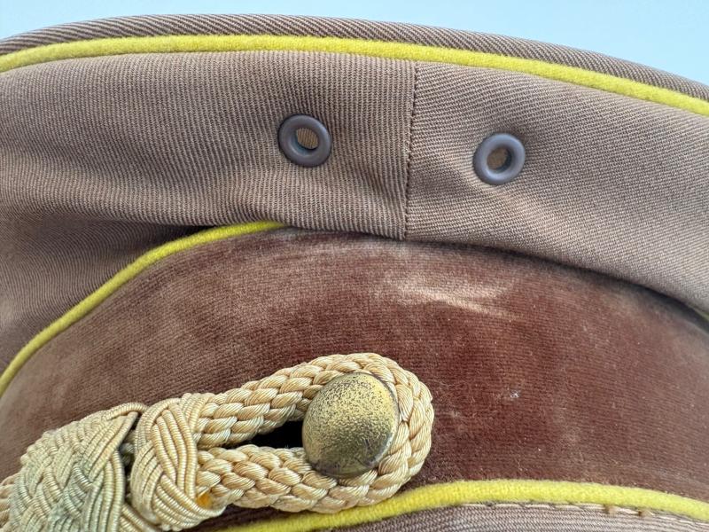 An extremely rare example of the Ordensburg peak cap, Superb looking and very fine gold yellow piped Political leaders’ hat in near mint condition. Good high front, brown top with dark brown velvet band and gold yellow piping for Ordensburg leaders cap. Complete with gilt metal eagle, large gilt cockade with swastika enamel badge, with gold cap cords which are held in place by two gilt buttons. To the side features two side gromets which are a distinctive feature of the Ordensburg caps over standard Reichs level political caps, making this an extremely rare item to obtain. The interior features pale gold silk lining with plain celluloid patch, which is in perfect condition. Leather sweatband with RZM label to the underside, two small splits to the sweat band but these are extremely minor and mentioned for accuracy. This is an extremely rare cap to obtain which is in near mint condition, probably the best I have seen for a very long time. I have seen one recently being offered for sale at an exclusive specialist militaria auction house with extensive moth damage estimated between £1500 – £2500