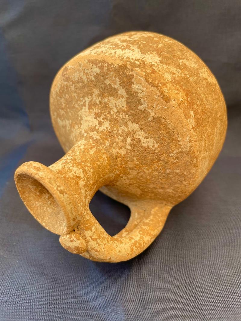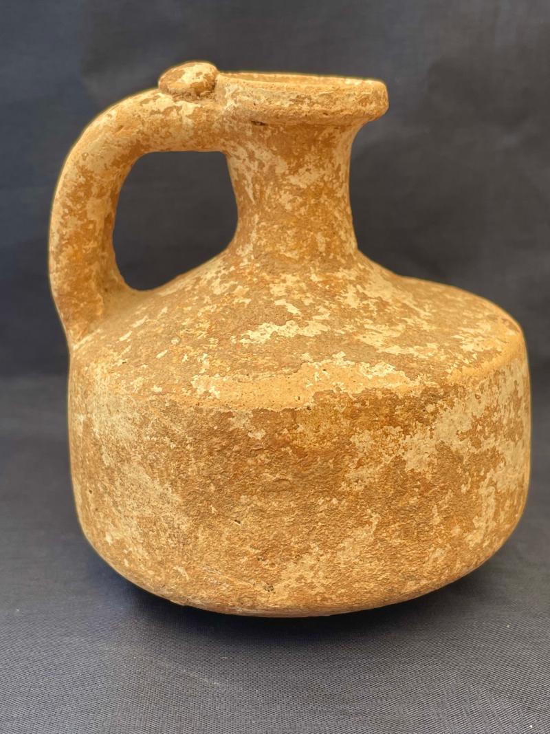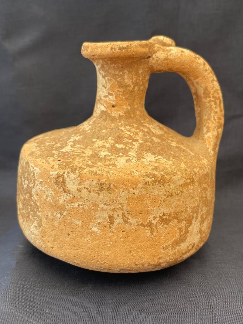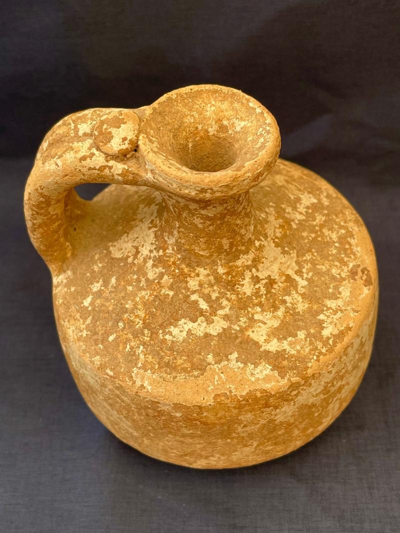 Totally original authentic roman terracotta anointing oil juglet dating from the beginning of the birth Jesus Christ. Ca. AD 1 - 300. A terracotta anointing oil juglet with a wide cylindrical body, sloping shoulder, and a short neck leading to a pronounced rim. A single arching handle connects the shoulder to the rim. For similar see: Monaghan, John. Roman Pottery from the Fortress: 9 Blake Street. York: York Archaeological Trust, 1997. Weight: 180g Provenance: Private UK collection, acquired on the US art market; Ex. collection of James Wolfensohn, NYC., acquired from Perspective Ltd., Jean-Michel Gozlan, King David Street, Jerusalem, Israel, 1990s. A Wonderful original roman juglet over 2000 years old.