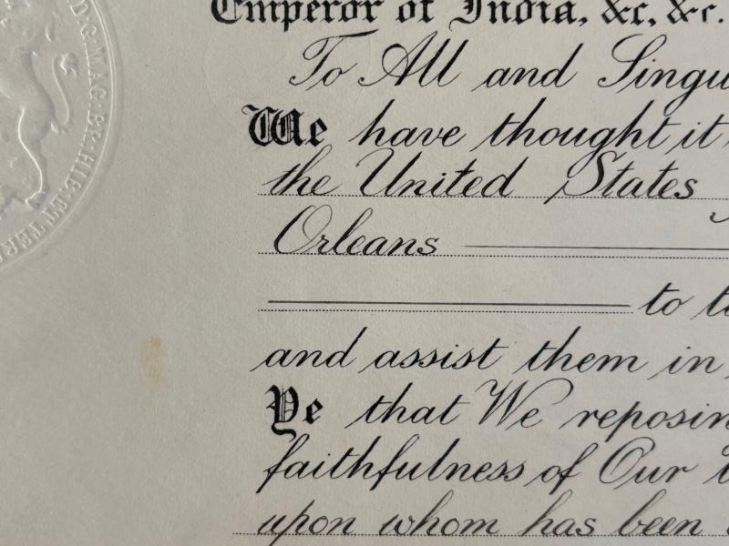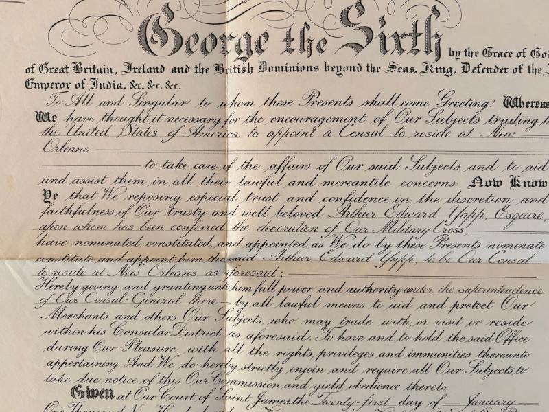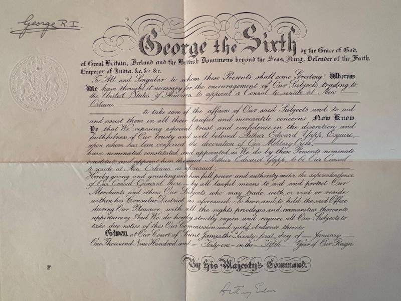 A wonderful opportunity to obtain an authentic totally Original Large War Time (WW2) Document hand signed in ink by His majesty King George VI (King of the United Kingdom) and Counter signed by Antony Eden (British foreign secretary). Beautiful conditioned large Document indeed dated Jan 12th 1941, to top corner a bold hand ink signature of King George VI, the Document is given at saint James palace to Arthur Edwards Yepps esquire , to be consul to New Orleans (the United States of America) Also mentioning his high Bravery Military Cross award ! , the document bearing a large royal embossed imprint stamp and royal watermarks with GvR and Kings crown , this document was signed on January 12TH 1941 during the famous Blitz of London, the united states of America had not yet entered the war but was soon involved and entered on December 1941. Counter signed to the bottom by Antony Eden (British foreign secretary. A fascinating British king’s hand signed document with connections to America New Orleans and mentioning the highly bravery Military Cross award. Please note the photos of the king George VI and the foreign secretary does not come with the sale of the document and is for reference only. I have taken close up photos of the document so its contexed can be read.