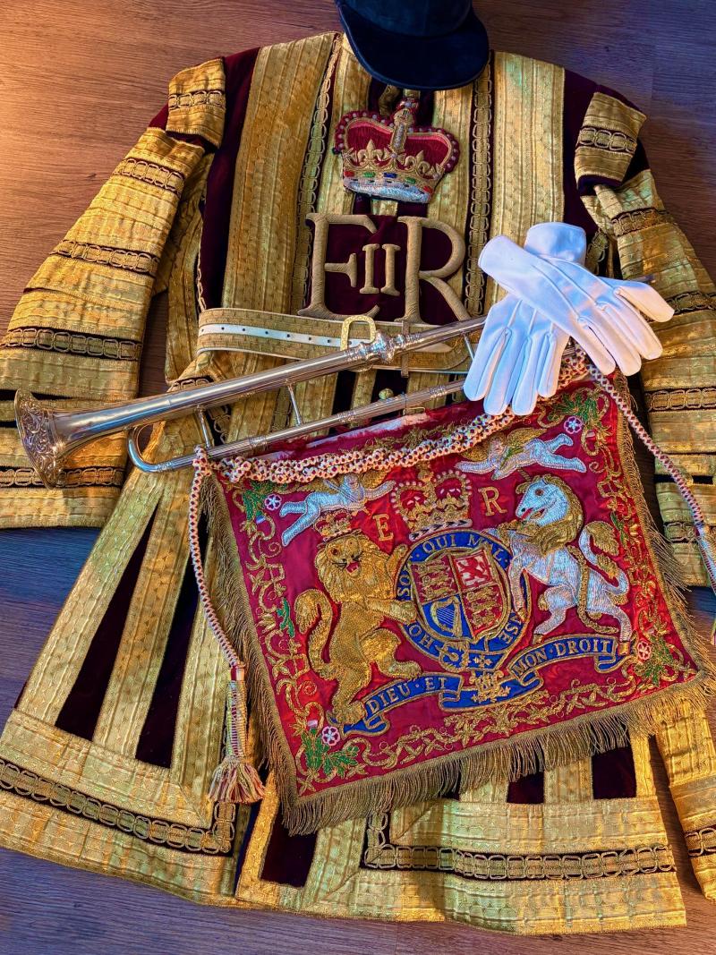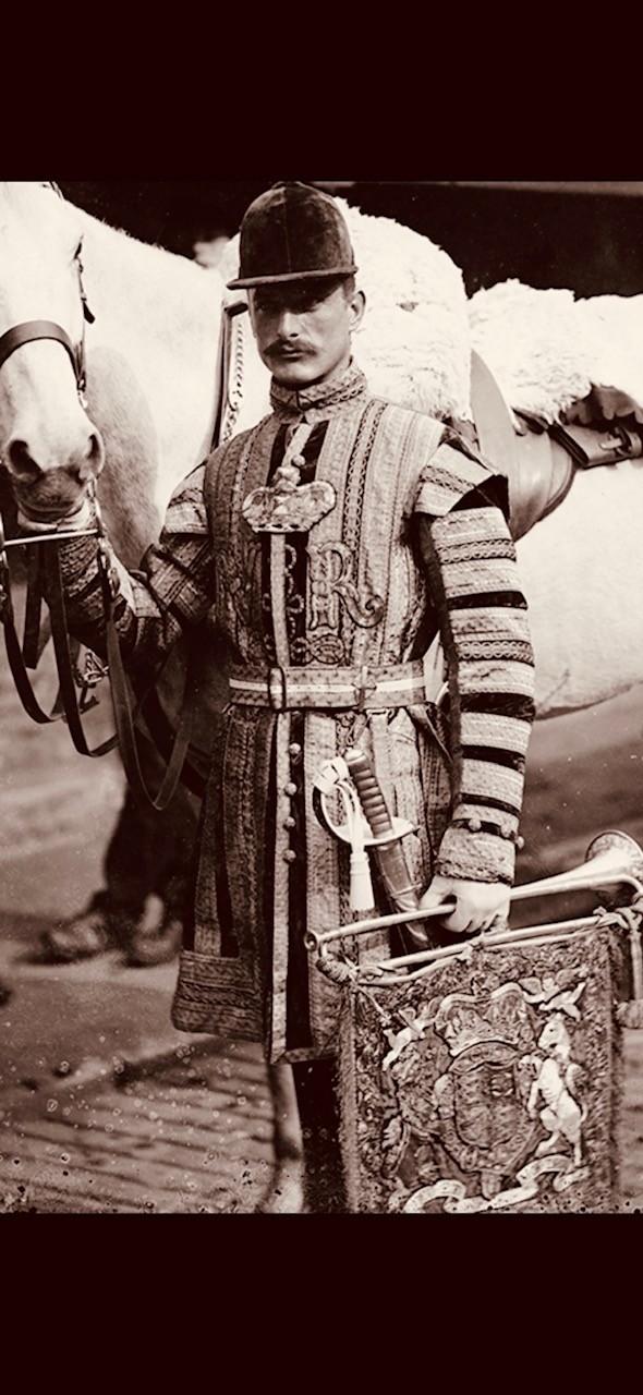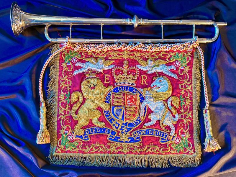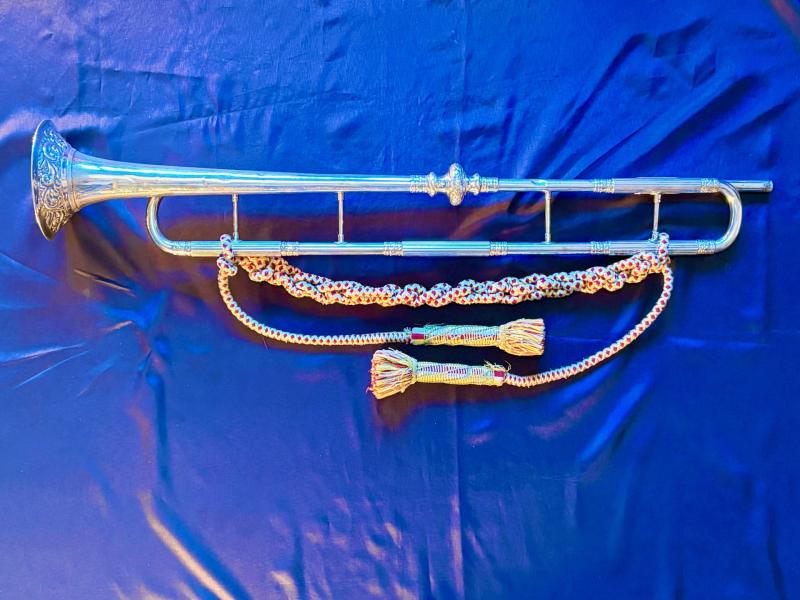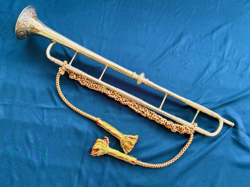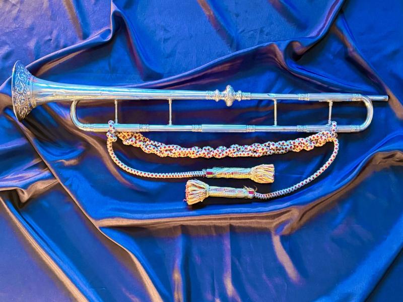 Authentic Rare Household Cavalry state trumpeter's ceremonial trumpet and tassels. ADDITIONAL PHOTOS