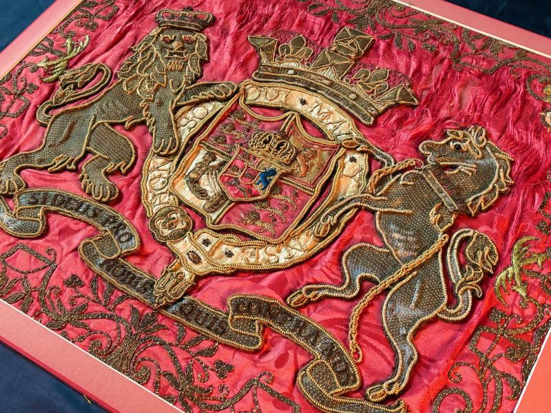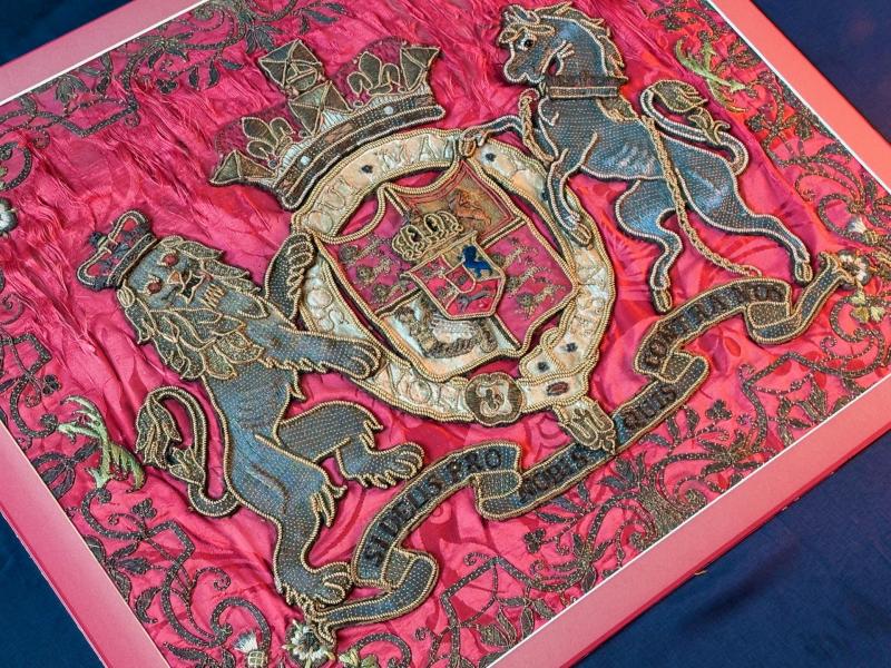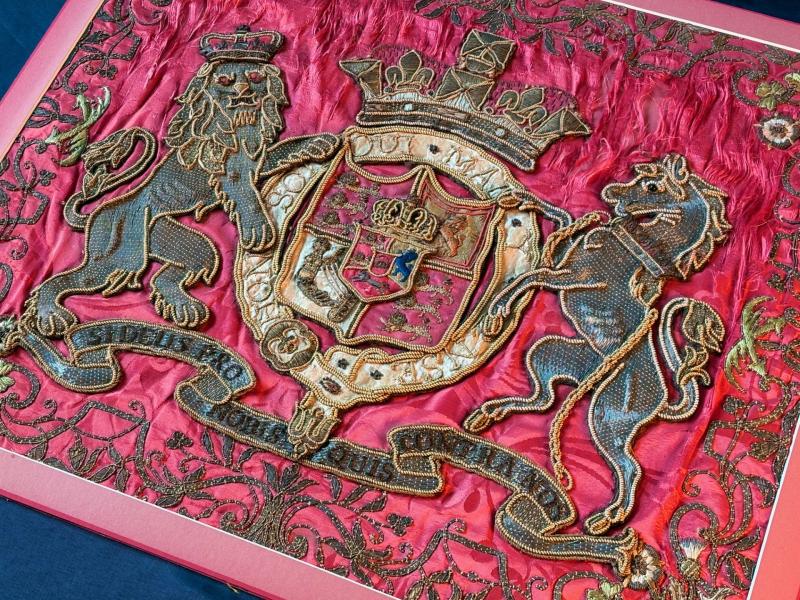 A wonderful opportunity to obtain an authentic original very rare cri 1801-King George III British Royal Silk flag Napoleonic war era, the flag is made of fine silk Damask and metal threads. Padded finishing, the flag is made in the most beautiful gilt bullion, hand applied embroidery finishing and depicting the British Monarchy Royal Coat of Arms with crown and shield flanked by the royal lion and unicorn, bordered in thick bullion foliage and national flowers, to crimson ground, Made from Crimson velvet silk with heavy gilt bullion lace embellishment. The workmanship is exquisite, this flag that is for sale was presented to Prince Augustus Frederick, Duke of Sussex one of the sons to King George III of the United Kingdom. It would have been commissioned for him when he became prince Augustus Frederick, Duke of Sussex in 1801 and is believed to be the only one to exist making it incredibly Rare indeed, the flag bears royal coat of arms of the United Kingdom The coat of arms of Prince Augustus Frederick, Duke of Sussex (1773-1843), was based on the Royal Arms of King George Ill the outer shield symbols on the quartered shield represent the three kingdoms of England, Scotland and Ireland. Either side of the shield stand the lion of England and the unicorn of Scotland. The corners of the flag are embroidered with roses, thistles and shamrocks, also symbols of the three unified kingdoms. with a motto 'SIDEUS PRO NOBIS QUIS CONTRA NOS’. A very rare flag to obtain indeed please note the photos of the prince and the army do not come with the sale of the flag and are for reference to the prince and the times it represents and the era. The flag comes mounted to red card backing, it has not been securely mounted, expect movement in transit can easily be pushed back into the card mount.