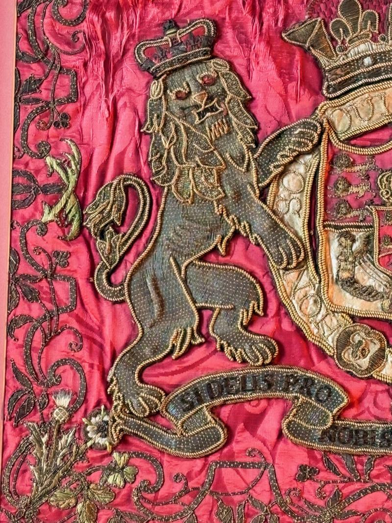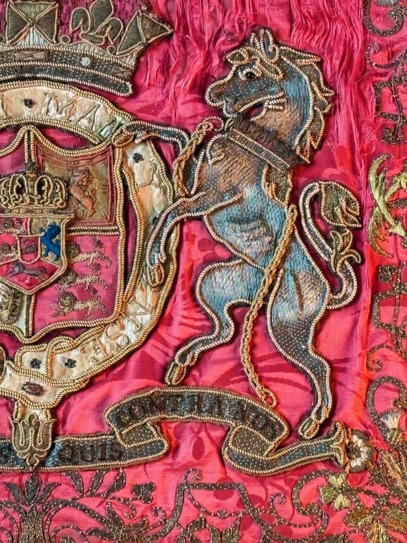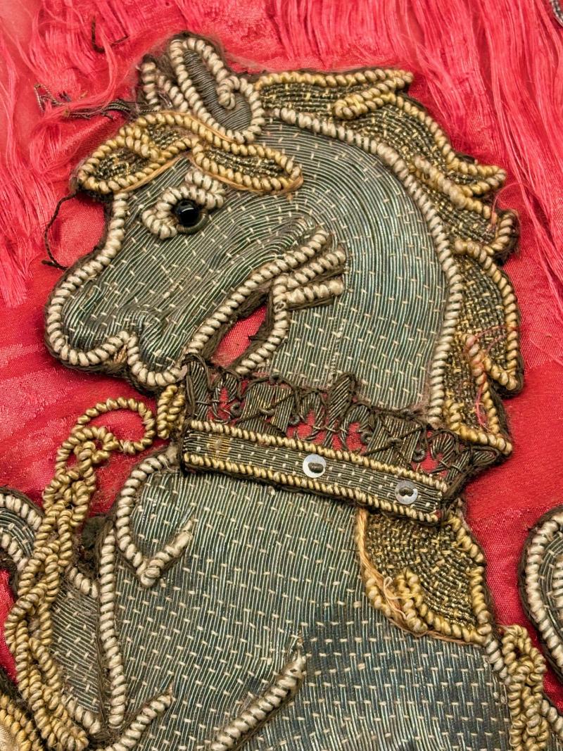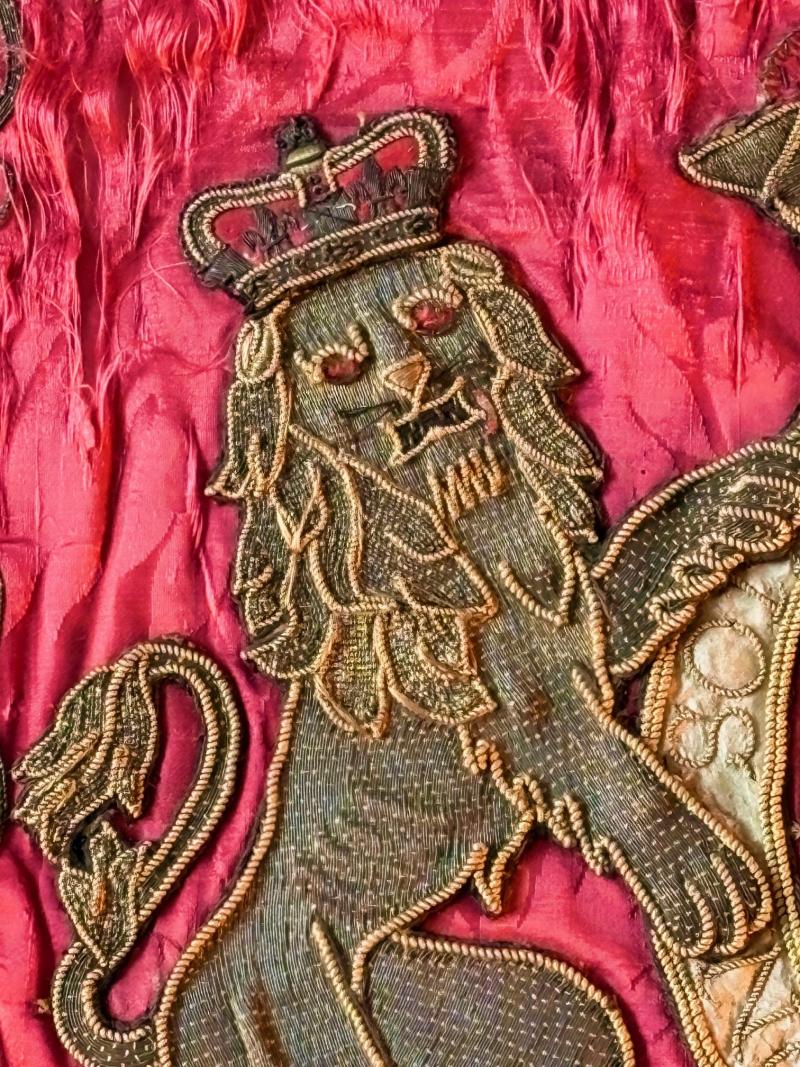 Condition: shredding to the flag upper section please see photos to form part of the description and to satisfy yourself, the flag is mounted within a red card, it has not been securely mounted, please expect moving in shipping can very easily be adjusted once received , eyes on lion missing, threading missing and thinning in some place, however it does not distract from his beauty and fine embroidery work and being over 225 years old and a one of a kind we believe to exist , the a very rare flag indeed,