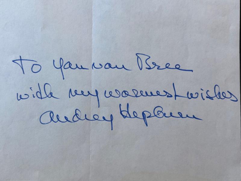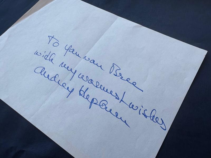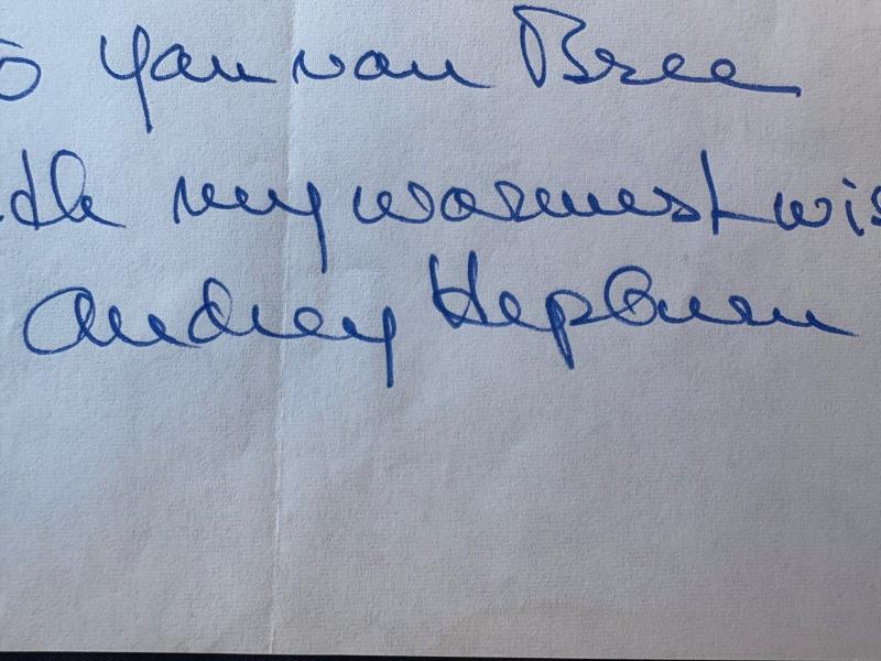 We are extremely pleased and proud to offer for sale a Very desirable, highly collectable authentic original rare Audrey Hepburn Hand signed in ink full autograph with a short inscription all in Audrey’s hand, this example measures 15cm x 21cm. One of the most recognizable highly famous actresses and fashion icons of all times Audrey Hepburn. Very Rare to find personal complete autographs signed by her together with an inscription all Audrey’s hand, Audrey Hepburn writes – to Jan van Bree with my warmest wishes Audrey Hepburn. Jan van Bree was a famous autograph collector for many years please see below about. The autograph and inscription are clear and bold and whiten on to paper, please note the photos of Hepburn do not come with the sale of the signed inscription and are for reference purposes only. Very Hard to find full autograph and inscription by one of the most famous actresses and beautiful women of all times Audrey Hepburn. Would look absolutely amazing framed. Please note overseas buys will be required to pay import and tariff taxes to their location.