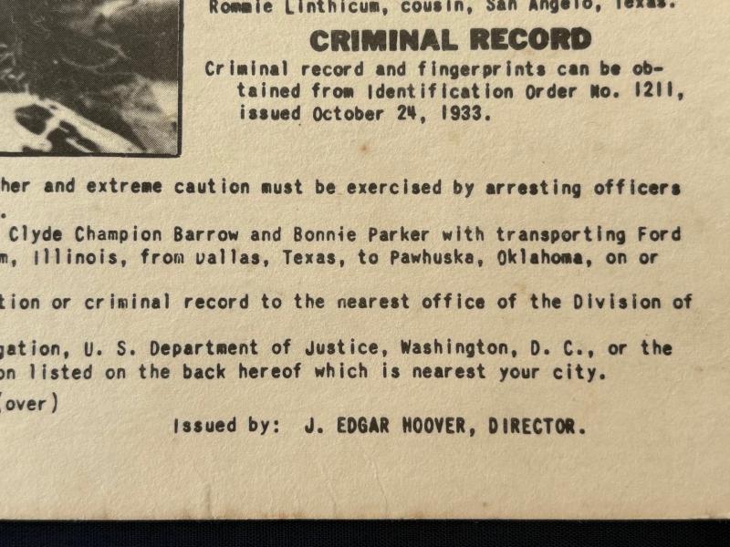 ORIGINAL BONNIE & CLYDE ISSUED WANTED POSTER DATED 1934