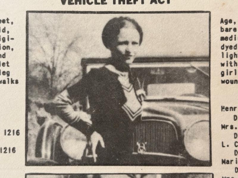 BONNIE & CLYDE: PARKER BONNIE (1910-1934) & BARROW CLYDE (1909-1934) American Outlaws and Criminals. An original printed small 4to Wanted poster (in the form of a folding mailshot) issued by J. Edgar Hoover and the United States Department of Justice, Washington D.C., 21st May 1934, under the National Motor Vehicle Theft Act. The poster features individual portraits of Bonnie and Clyde as well as descriptions of each (including scars, peculiarities, marks etc.) and a list of their relatives and details of their criminal records. The printed text also states 'Clyde Champion Barrow and Bonnie Parker constantly travel together and extreme caution must be exercised by arresting officers...' A list of telephone numbers of the various state Department of Justice offices is printed to the verso. There have been many movies and documenters even a pop song about Bonnie and Clyde over the years bring much curiosity to them as outlaws and lovers, original personal artifacts collectables belonging to them are avidly collected and command large premiums, this particular example would look fantastic framed and mounted, please note that the photos of bonnie and Clyde are for reference only and do not come with the sale of the original poster.